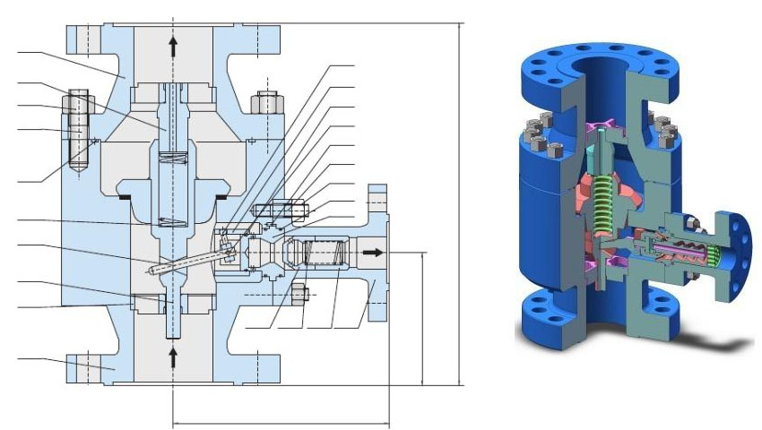 根據(jù)主流量不同,再循環(huán)閥的主閥閥瓣將被確定在某一個(gè)位置上,主路止回閥的閥桿通過一杠桿,將主閥瓣動(dòng)作傳遞至旁路,旁路系統(tǒng)控制通過旁路的流量同時(shí)將壓力減至出口所需值,當(dāng)主閥瓣回到閥座關(guān)閉狀態(tài)時(shí),所有流量通過旁路(回流),當(dāng)主閥瓣上升到頂端位置時(shí),旁路則完全關(guān)閉,所有泵的流量流向工藝系統(tǒng)。