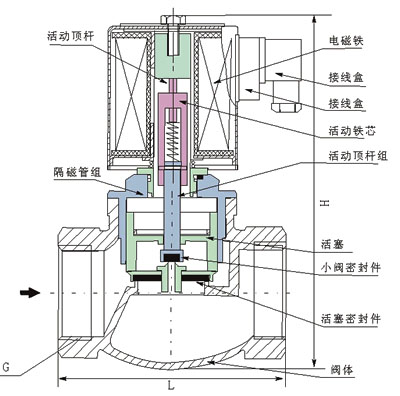 本閥為分步動作直接先導式電磁閥,可根據(jù)斷電時所處開、關(guān)狀態(tài)的不同,可分為常閉式電磁閥和常開式電磁閥。常閉電磁閥,線圈通電后,銜鐵在電磁力作用下先帶動副閥閥塞提起,主閥閥杯上的流體經(jīng)副閥流走,減少了作用在主閥閥杯上的壓力,當主閥閥杯上的壓力減少到一定值時,銜鐵帶動主閥閥杯,并利用壓差而使主閥閥杯開啟,介質(zhì)流通。線圈斷電后,電磁力消失,銜鐵因自重下落復位。同時依靠介質(zhì)壓力,主副閥得以緊密關(guān)閉。常開電磁閥,線圈通電后由于吸力作用,動鐵芯下移,把副閥閥塞壓下,副閥關(guān)閉,主閥閥杯內(nèi)壓力上升,當壓力升到一定值時,主閥閥杯的上下壓差一樣,由于電磁力作用,動鐵芯失去主閥閥杯下,壓緊主閥閥座,閥門關(guān)閉。線圈斷電時,電磁吸力為零,副閥閥塞和支鐵芯由于彈簧作用向上提起,副閥打開,主閥閥杯上的流體經(jīng)副閥流走,減少了作用在主閥閥杯上的壓力,當主閥閥杯上的壓力減少到一定值時,利用壓差把主閥閥杯推起,主閥打開,介質(zhì)流通。