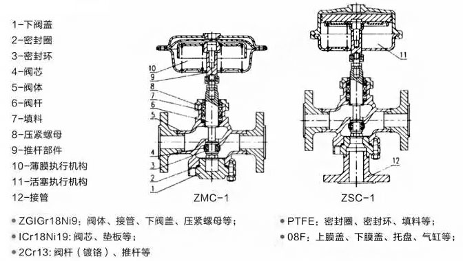 ZMC或ZSC型氣動(dòng)二位切斷閥,由氣動(dòng)薄膜(活塞)執(zhí)行機(jī)構(gòu)和切斷閥兩部分組成,當(dāng)無(wú)信號(hào)輸入時(shí),執(zhí)行機(jī)構(gòu)由于彈簧預(yù)緊力,使閥芯關(guān)閉閥座,當(dāng)輸入350KPa空氣信號(hào)壓力時(shí),由活塞所產(chǎn)生的推力作用于托盤(pán)推動(dòng)閥桿向下動(dòng)作,使閥芯關(guān)閉下閥座,以實(shí)現(xiàn)管道內(nèi)流動(dòng)介質(zhì)的切換或切斷。