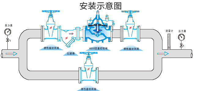 400X流量控制閥由主閥、流量調(diào)節(jié)閥、針閥、導(dǎo)閥、球閥、微形過濾器和壓力表組成水力控制接管系統(tǒng)。利用水力自動操作,控制和調(diào)節(jié)主閥開度,使通過主閥的流量保持不變。