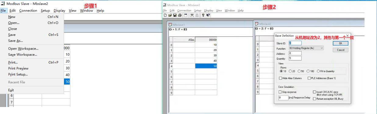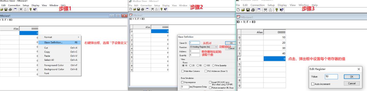 然后設(shè)置寄存器,以及寄存器的值。演示案例設(shè)置了0-4 、5個(gè)寄存器,值分別設(shè)置為 10-50,如下圖所示: