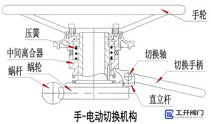 手動(dòng)操作電動(dòng)執(zhí)行器的裝置,通常由手動(dòng)機(jī)構(gòu)、離合器和齒輪等部分組成。其中,手動(dòng)機(jī)構(gòu)部分是用來(lái)手動(dòng)切換的,離合器則用來(lái)連接或者斷開(kāi)電機(jī)和傳動(dòng)部分之間的機(jī)械聯(lián)系,齒輪則起到傳遞力量的作用。