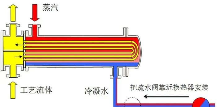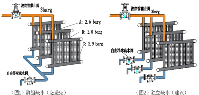 為確保各設(shè)備的高效換熱,應(yīng)避免多臺設(shè)備或一臺設(shè)備的不同加熱段共用一個疏水閥進行疏水。每臺設(shè)備都應(yīng)獨立安裝疏水閥。