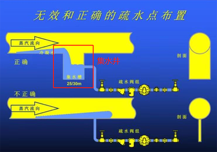 為確保蒸汽管道中的冷凝水能夠順暢排出,主管道上應(yīng)設(shè)置一個接近主管道半徑的冷凝水集水井。