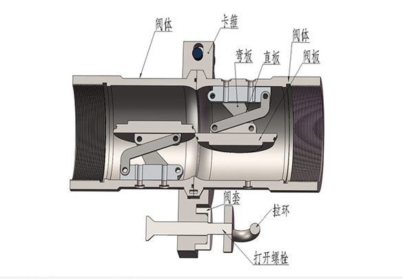 拉斷閥由兩個(gè)單向閥、夾緊機(jī)構(gòu)、拉斷機(jī)構(gòu)三個(gè)部分組成。