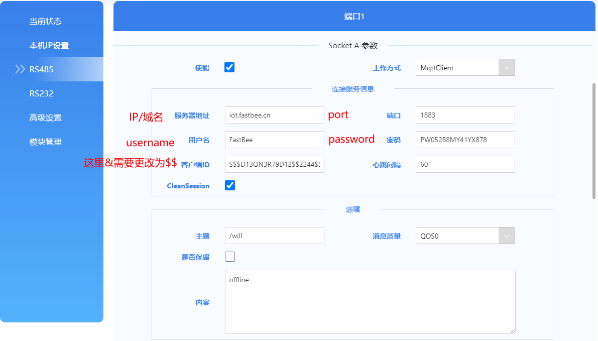 1、配置設(shè)備的連接信息(PS:這里的clientId中 & 需要替換為 $$ S&D13QN3R79D12&2244&1 ----> S$$D13QN3R79D12$$2244$$1)